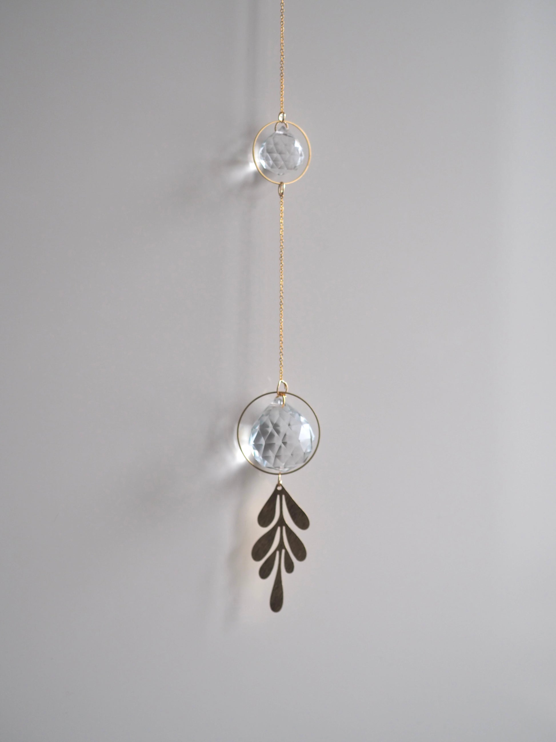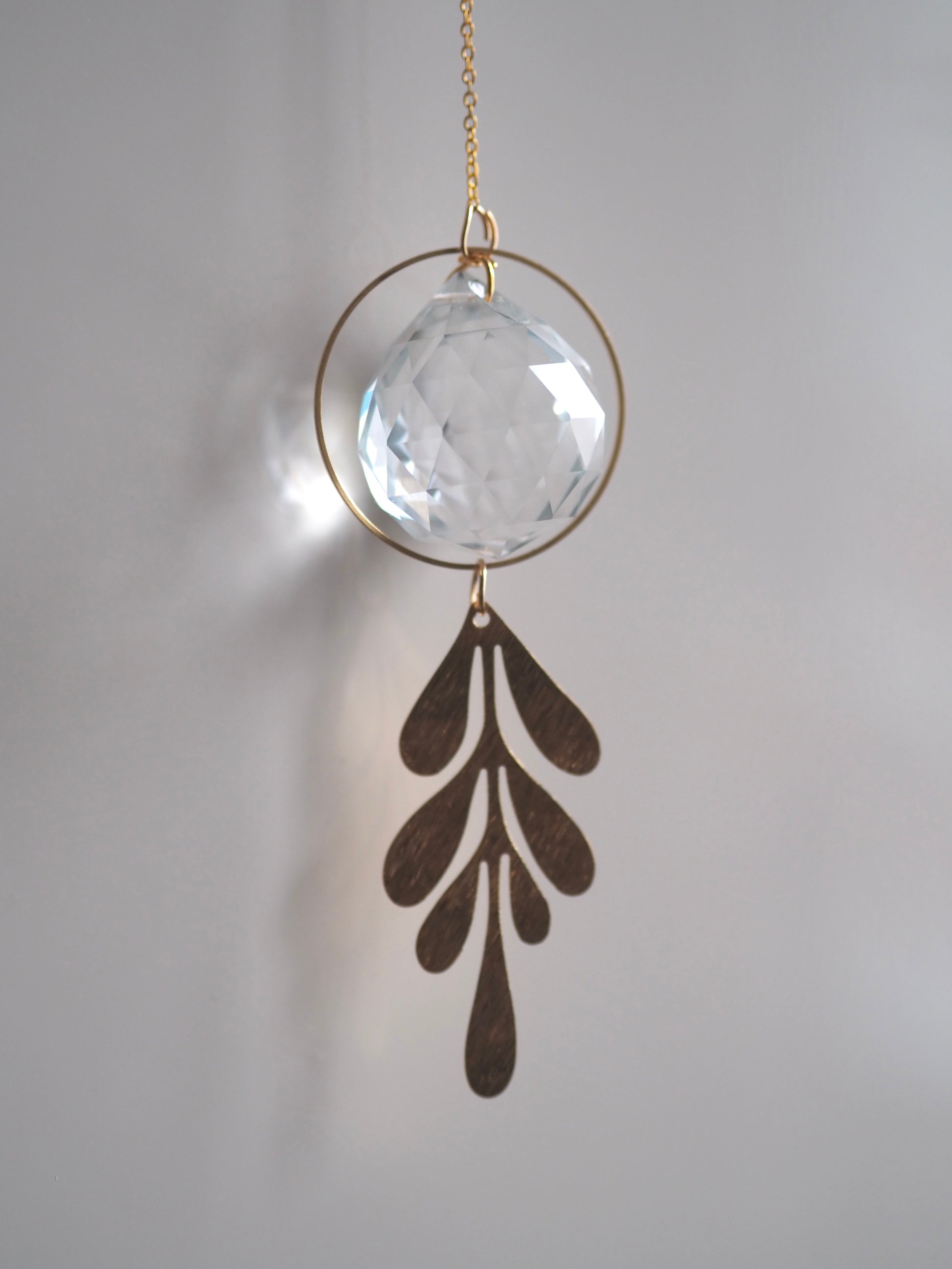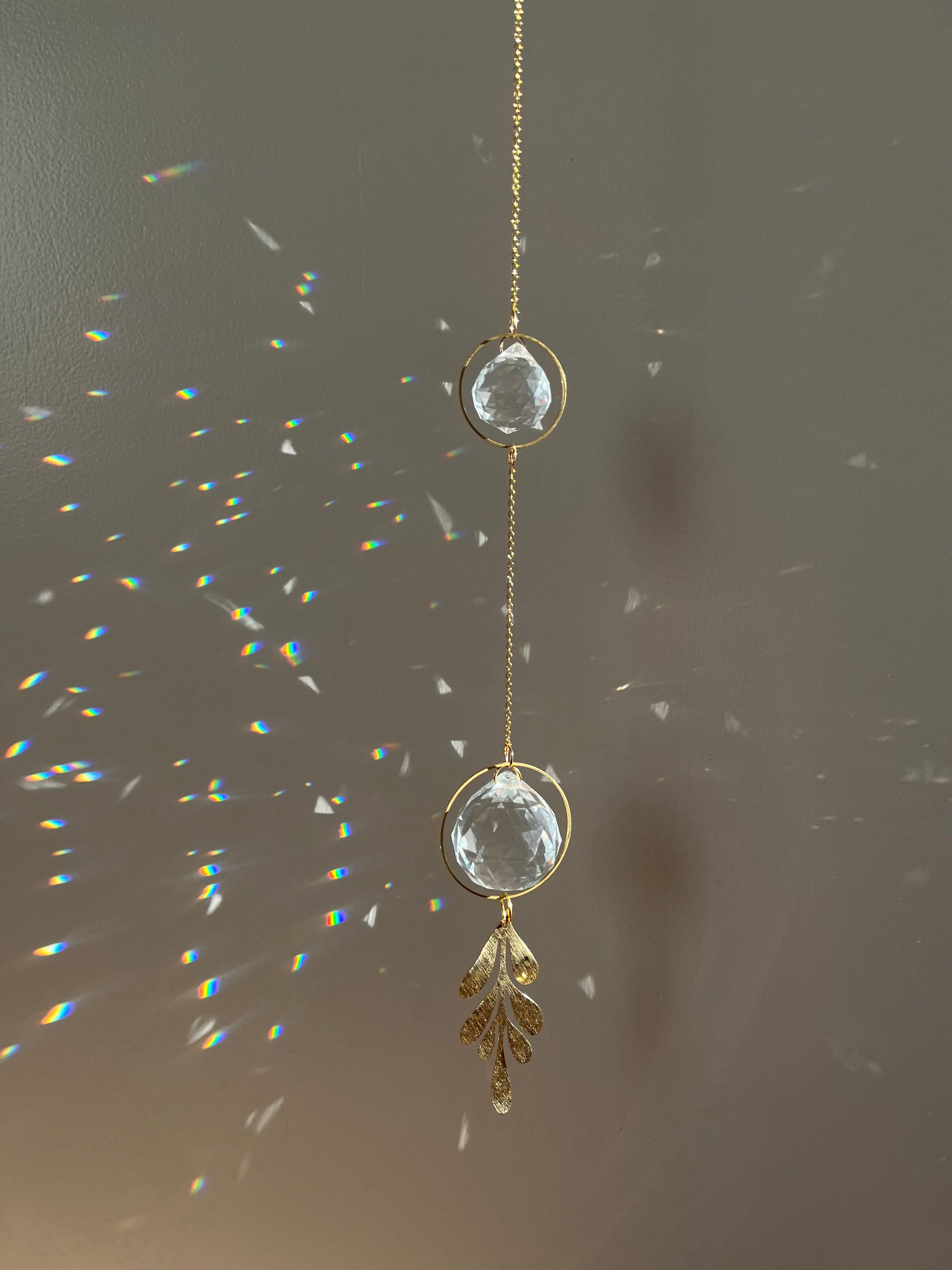 Großer Lichtfänger mit einer Länge von ca 75cm. Integriert sind zwei Kristalle (2&3cm) und ein abschließendes Blatt.