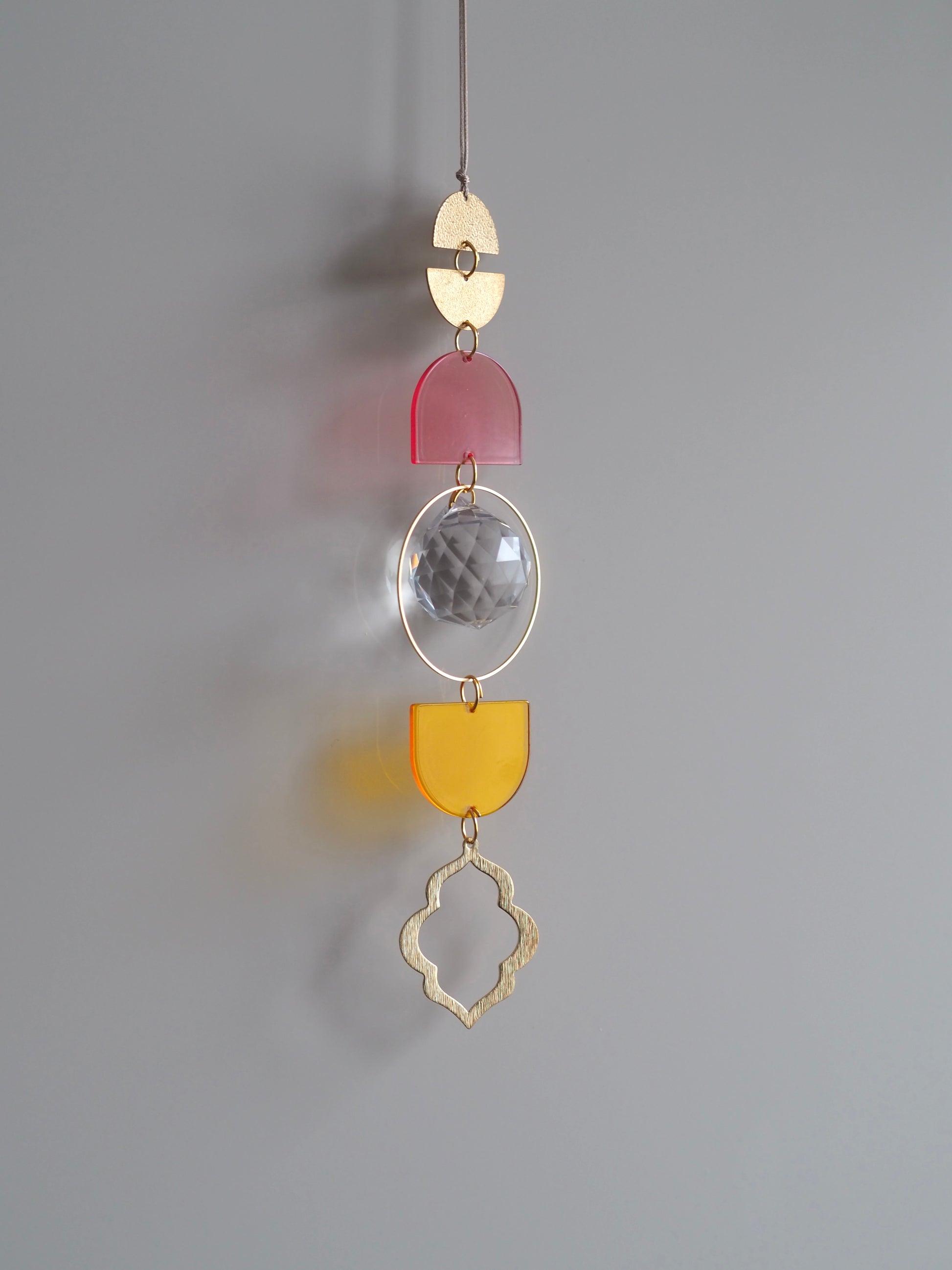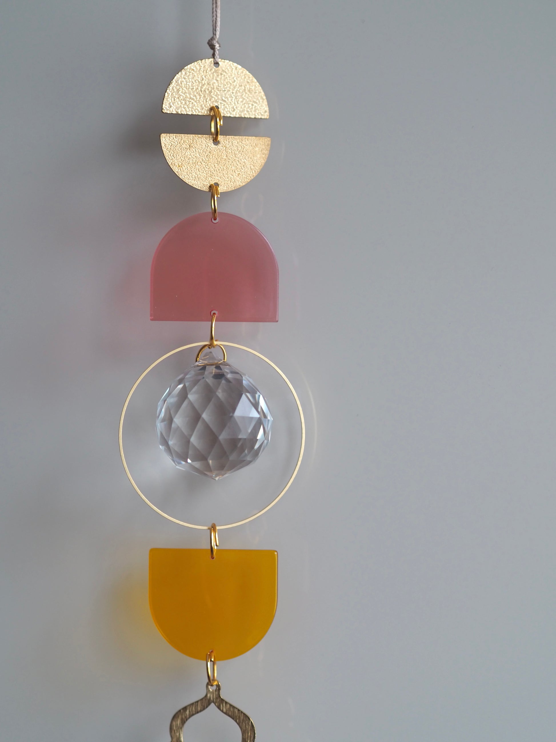 Integriert ist ein 3cm großer Kristall. Die Länge des Lichtfängers ist ca 20cm und er wird an einem 40cm langem Wachsband befestigt.