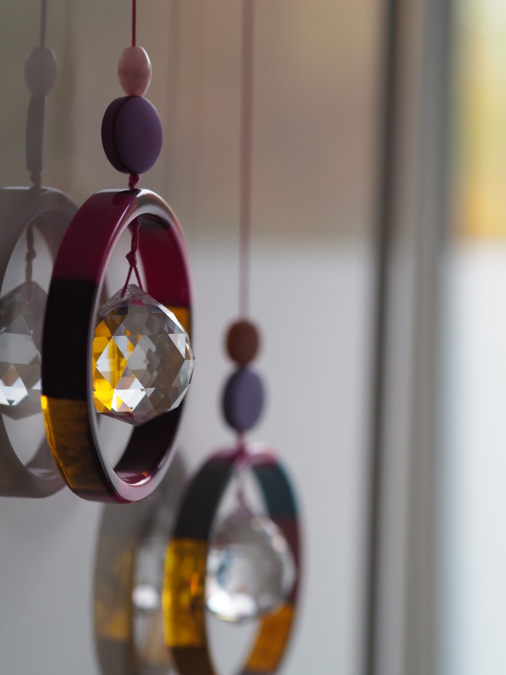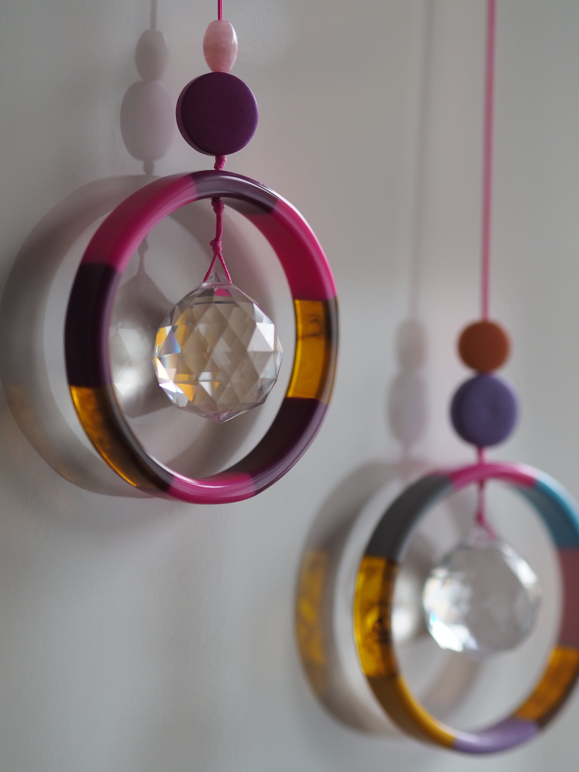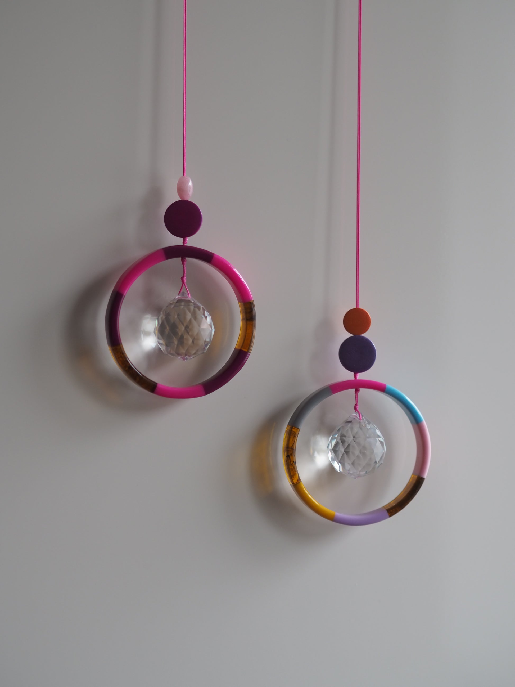 Pinke Suncatcher mit einem integrierten 3cm großem Kristall. Der Ring um den Kristall ist 7cm groß und der SUNCATCHER wird an einem 40cm langem Wachsband befestigt